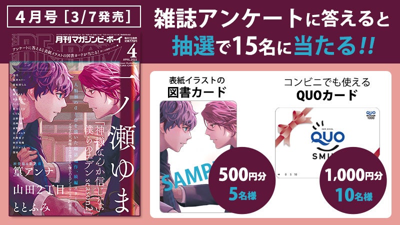 株式会社リブレ(本社:東京都新宿区、代表取締役社長:太田歳子)は、一ノ瀬ゆま先生が表紙の雑誌「マガジンビーボーイ2022年4月号」を3月7日に発売いたします。https://www.b-boy.jp/magazine/194267