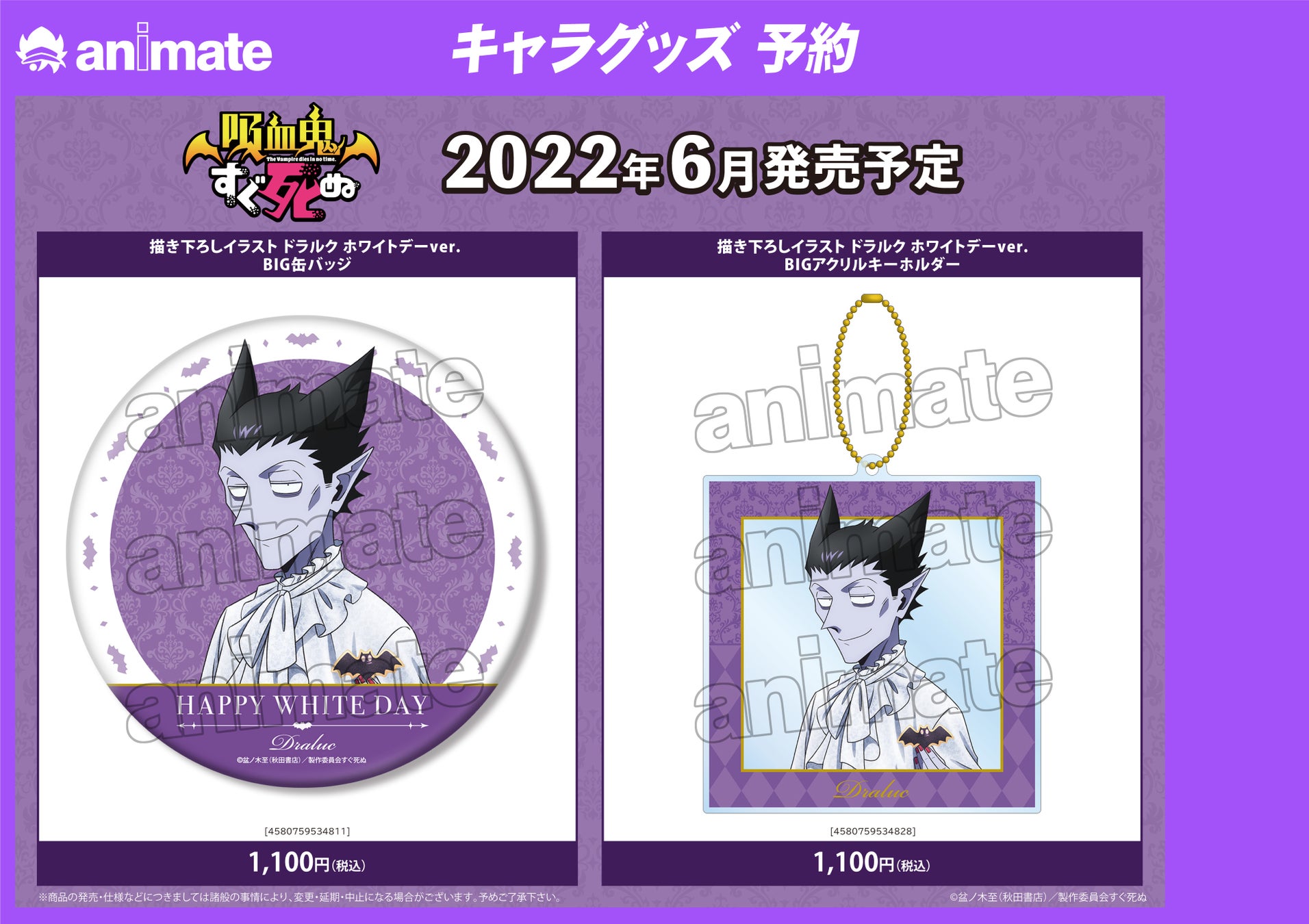 期間中、アニメイト通販にてTVアニメ『吸血鬼すぐ死ぬ』関連の対象キャラクターグッズをご予約1,100円(税込)毎にフェア限定購入特典「ブロマイド(全2種)」をランダムで1枚プレゼント!