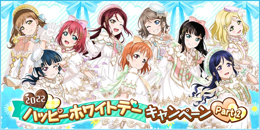 株式会社ブシロード(本社:東京都中野区、代表取締役社長:橋本義賢)は、KLab株式会社(本社:東京都港区、代表取締役社長:森田英克)と共同開発いたしましたスマートフォン向けアプリ『ラブライブ!スクールアイドルフェスティバル』(以下、スクフェス) において2022ハッピーホワイトデーキャンペーン Part2の開催をお知らせいたします。是非貴社の媒体にてお取り扱い頂きますようお願い申し上げます。