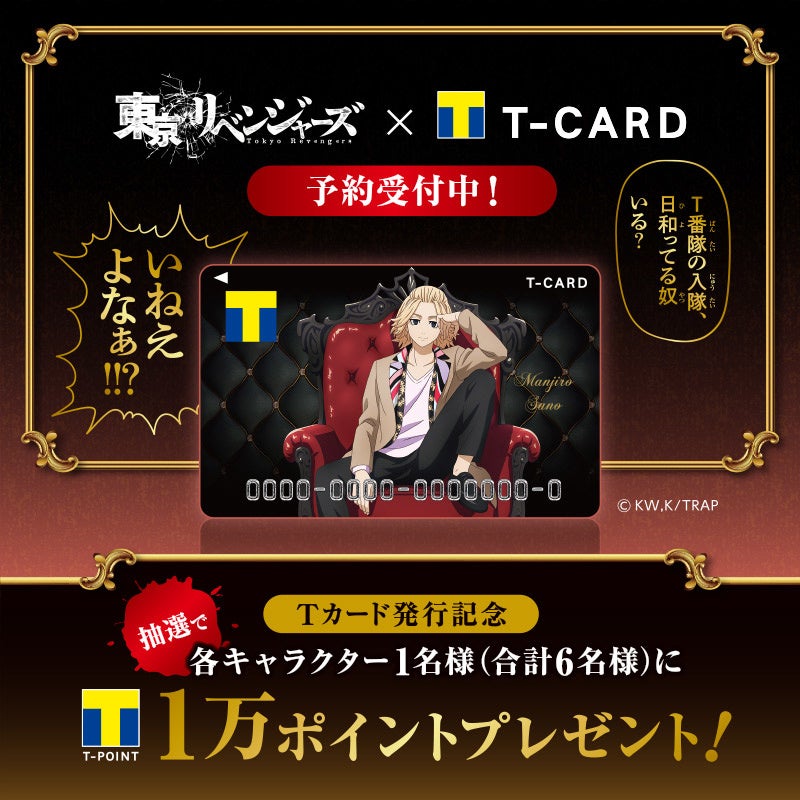 3月14日(月)~3月20日(日)までの期間、Tポイント公式(@tpoint)をフォローして、「#東リベのTカード +キャラクター名」を付けて引用ツイートした方の中から、抽選で各キャラクター1名様(合計6名様)にTポイント1万ポイントをプレゼント!