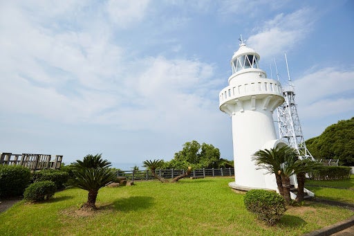 細島港入口の日向岬に位置する灯台。1910(明治43)年に赤レンガ造りの灯台として造られ、1941(昭和16)年に現在の灯台に。半円アーチ型の出入り口、バルコニーを支える持ち送りのデザインが特徴的。2019(平成31)年に国の有形文化財に登録された。