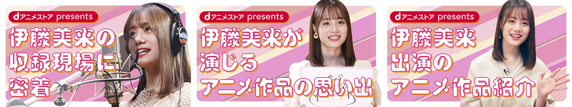 dアニメストアでは、新CMの公開に合わせて特別番組「dアニメストアpresents 伊藤美来とアニメにまつわるエトセトラ」を制作!普段なかなか見ることができないCMの収録現場に密着した秘蔵映像をはじめ、伊藤美来が演じるアニメ作品の思い出など、このたびの企画でしか見られない3つの撮りおろし動画を順次公開。新CMのキャラクターの声をキュートに彩った伊藤美来の魅力を、dアニメストアが全力でお届けします。