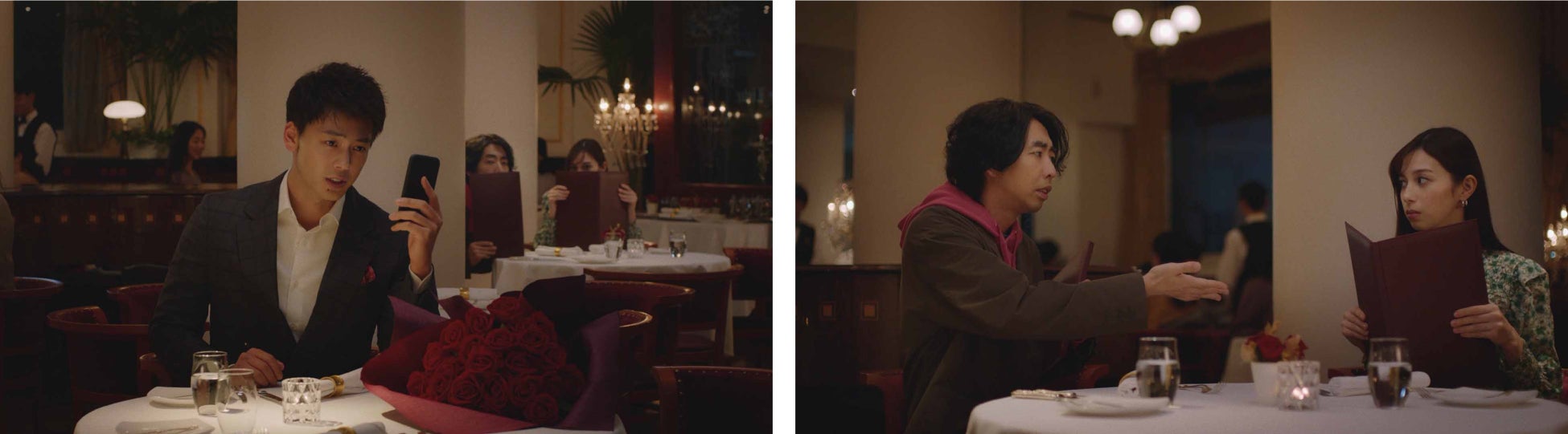 新TVCMは、兄・竹内さんがレストランで愛の告白をしようとするところを、妹・中条さんと二人の幼馴染・柄本さんが、遠くから見守っているストーリーです。「マンガ愛#1 尾行篇」では、幼馴染・柄本さんが兄・竹内さんの姿に刺激を受けて告白するも、あえて聞き直す妹・中条さんのチャーミングな表情や、それに動揺する柄本さんと中条さんのコミカルなやりとりが見どころです。また、「マンガ愛#5告白篇」では、コミックシーモアの試し読みで知ったマンガのセリフを参考に、キザな表情で愛の告白の練習に励む竹内さんの姿に注目です。
