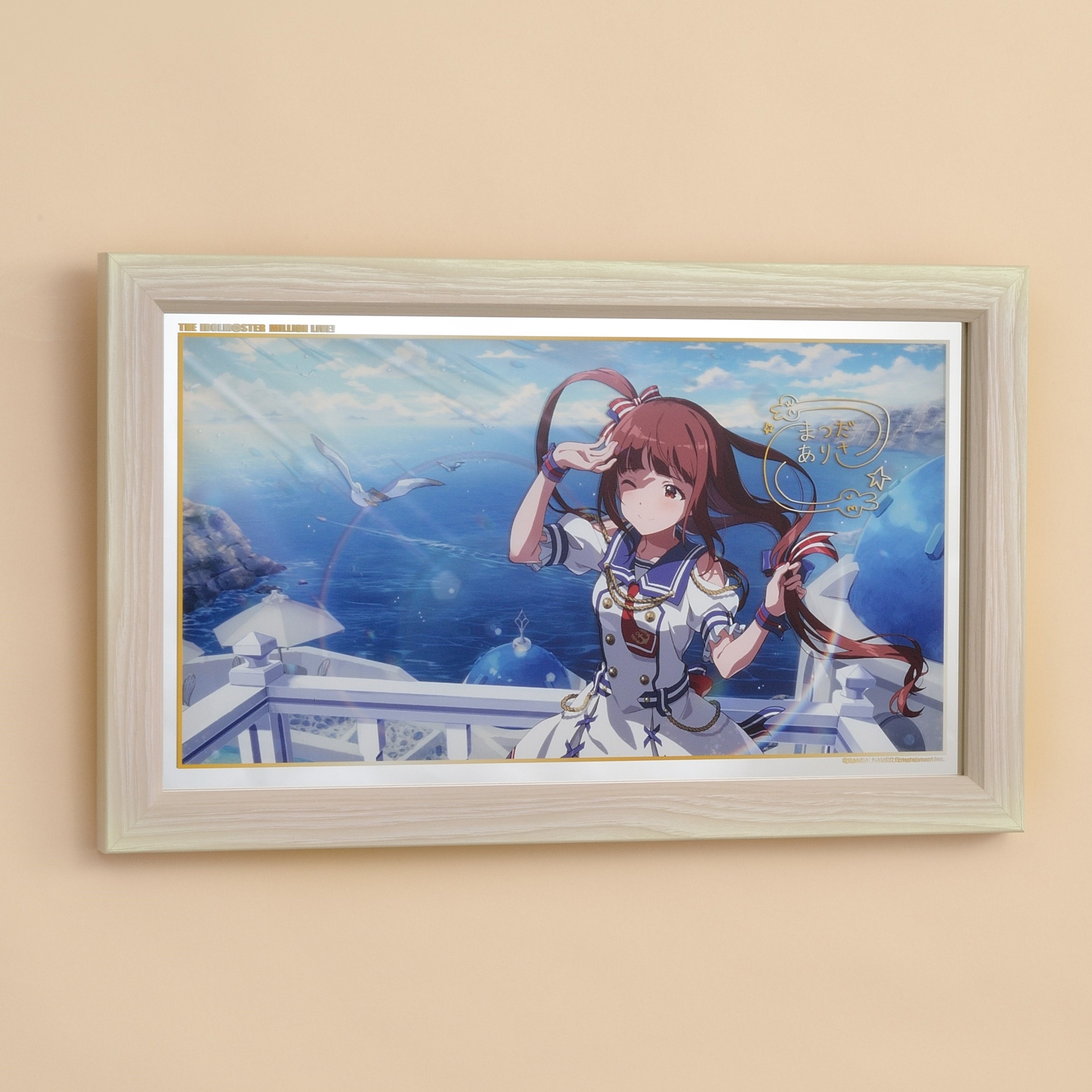 ずっしりとした木枠に収められた美しく輝くガラス製のミラー。ガラス製ミラーの特性に合わせた処理が可能にしたポートレート写真のような奥行きのある立体的な表現。一面に広がる大海原を背景に、マリンカラーの衣装を身にまとった彼女の爽やかな魅力溢れる一面を切り取った一枚がここに完成しました。