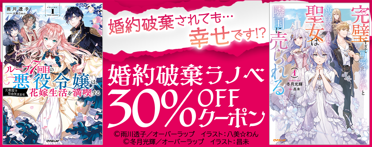 大ブレイク中の”婚約破棄”ラノベ! 「auブックパス」では、『ループ7回目の悪役令嬢は、元敵国で自由気ままな花嫁生活を満喫する』や『完璧すぎて可愛げがないと婚約破棄された聖女は隣国に売られる』など、人気ラノベ作品を対象とした30%OFFクーポンを配布するフェアを開催。ライトノベル読者必見の人気作品、期待作品をぜひこの機会にお楽しみください。