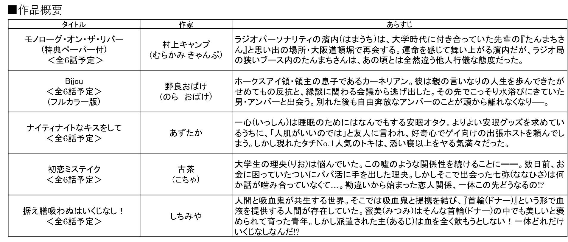 株式会社NTTぷららは、BLコミックレーベル「pirka⋆2(ピリカピリカ)」より、第3弾となるオリジナルWebコミックスの新連載5作品の配信を1,2話同時でスタートします。