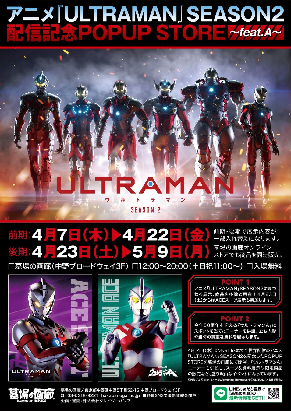 4月7日(木)〜5月9日(月)までの期間中、アニメ『ULTRAMAN』SEASON2配信を記念したPOPUP STOREを墓場の画廊(東京・中野)にて開催!また、今年放送50周年を迎える『ウルトラマンA』にスポットを当てたコーナーも同時展開。他にもウルトラマン関連商品がずらりと並び、店内はウルトラマン一色に!4月23日(土)からは一部展示入替あり。最後まで楽しめる内容となっております。