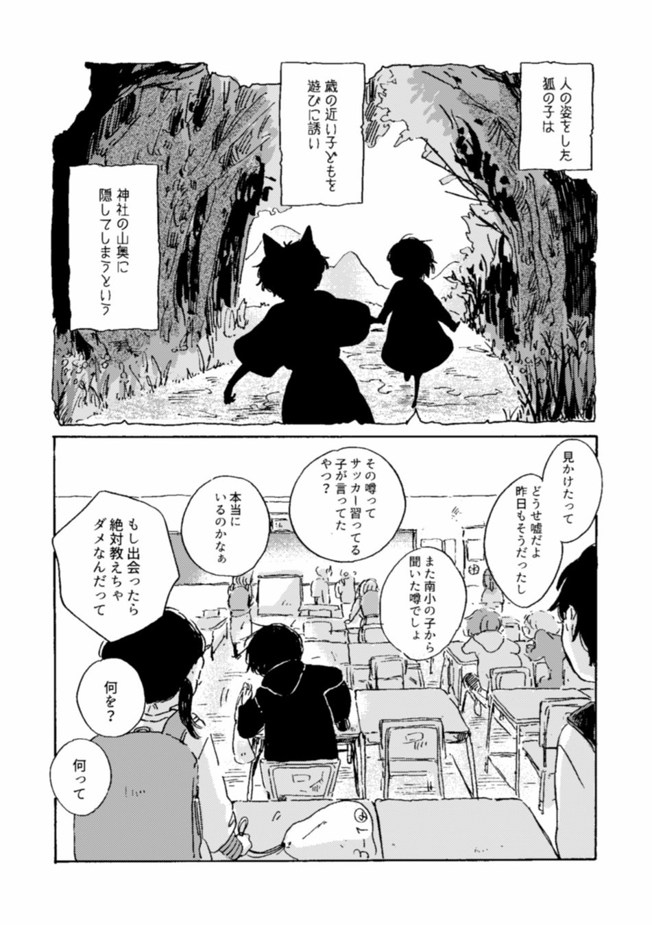 「神社の近くには、⼈間に化ける狐の⼦どもがいる。 しかも、⼈の姿をした狐の⼦は、⼦どもを誘い出しては⼭奥に隠してしまう。」 という噂がクラスの⼀部で⽴っていた。