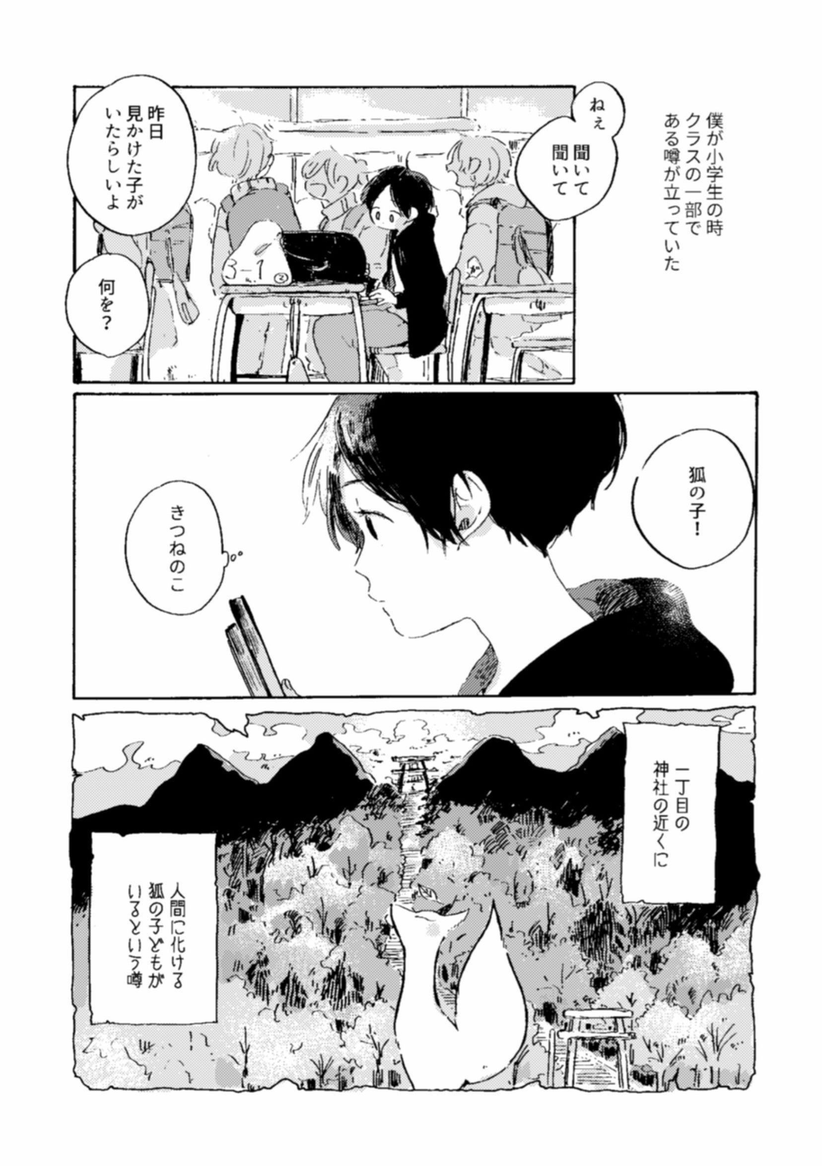「神社の近くには、⼈間に化ける狐の⼦どもがいる。 しかも、⼈の姿をした狐の⼦は、⼦どもを誘い出しては⼭奥に隠してしまう。」 という噂がクラスの⼀部で⽴っていた。