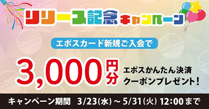 キャンペーン期間中に、特設サイトを経由してエポスカードに新規ご入会した方にもれなく、3,000円分のエポスかんたん決済クーポンをプレゼントいたします。