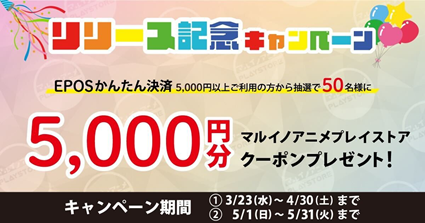 キャンペーン期間中に、エポスかんたん決済で5,000円以上決済した方の中から抽選で50名さまに「マルイノアニメPLAYSTORE」で使える、マルイノアニメ プレイストアクーポンを5,000円分プレゼントいたします。