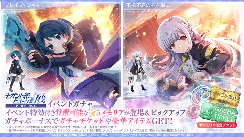 イベント「ギガント級ヒュージ討伐アビスサーペント」での一場面を描いた★5メモリア「ブレイブ・ショット」「不撓不屈の心を胸に」の2枚が初登場する、「ギガント級ヒュージ討伐アビスサーペントイベントガチャ」を開催します。「ブレイブ・ショット」「不撓不屈の心を胸に」は「ギガント級ヒュージ討伐 -アビスサーペント- Chapter.1」での特効効果付きです。
