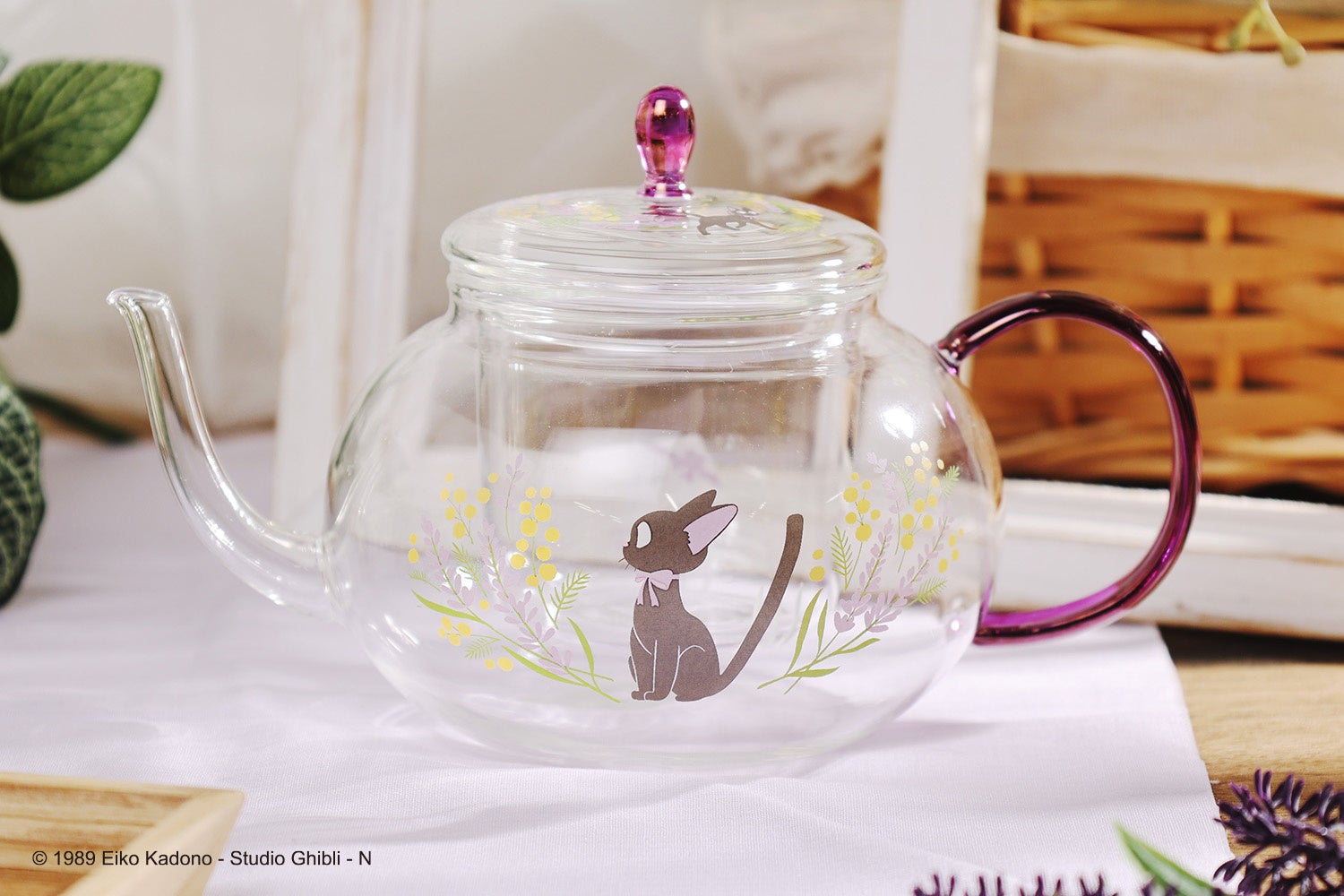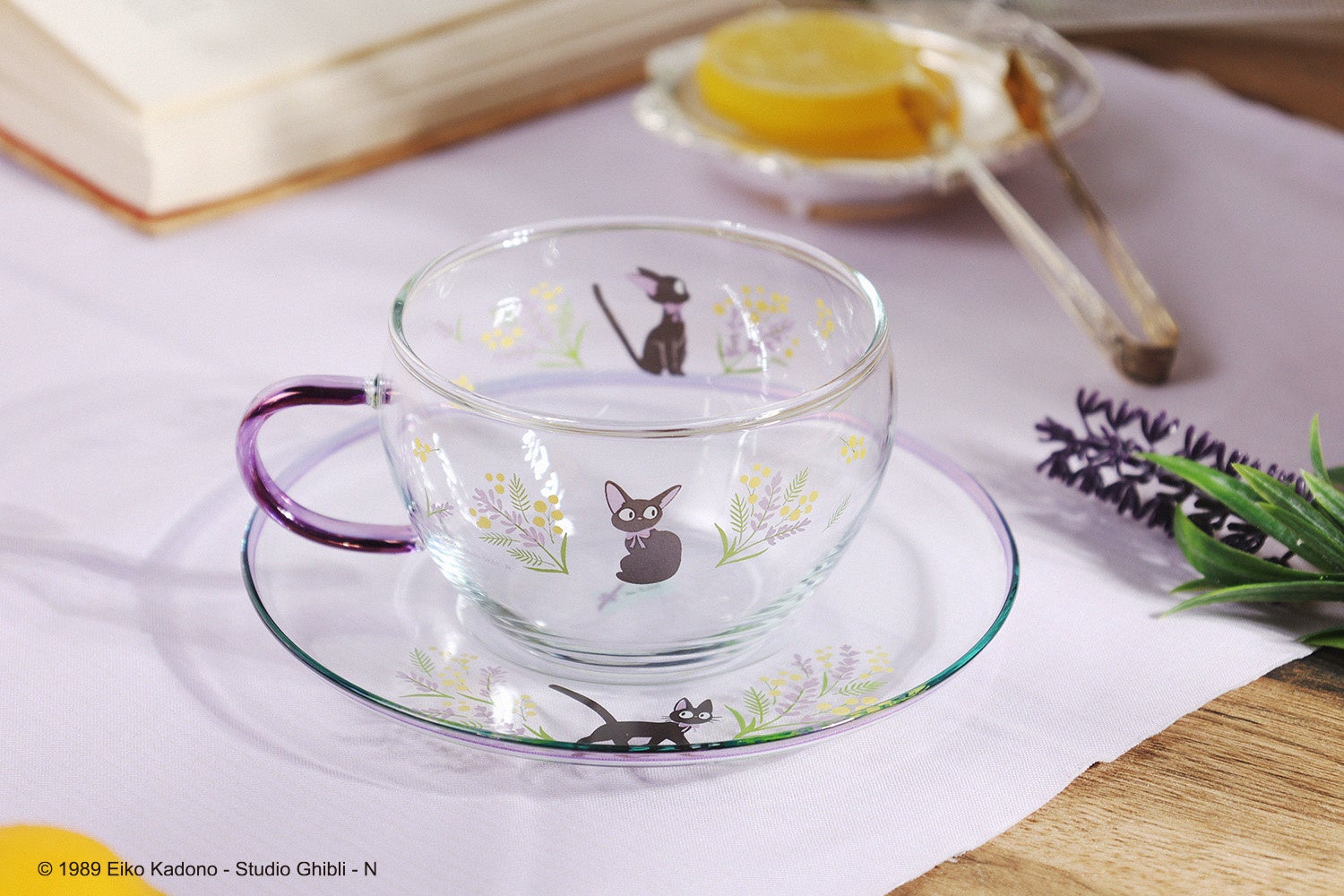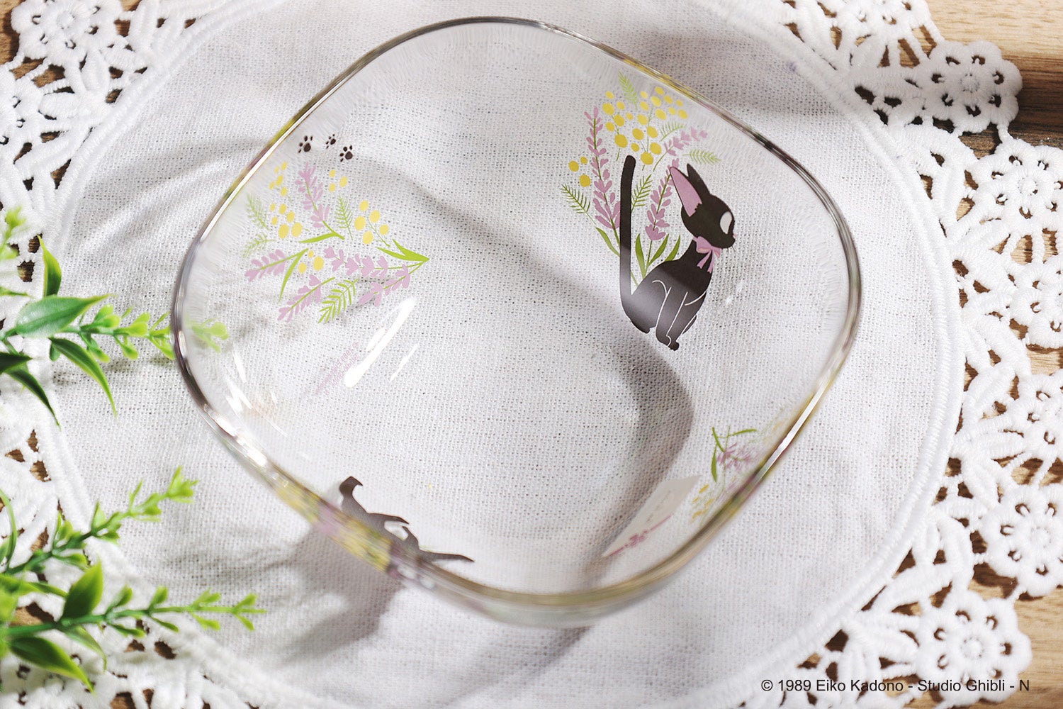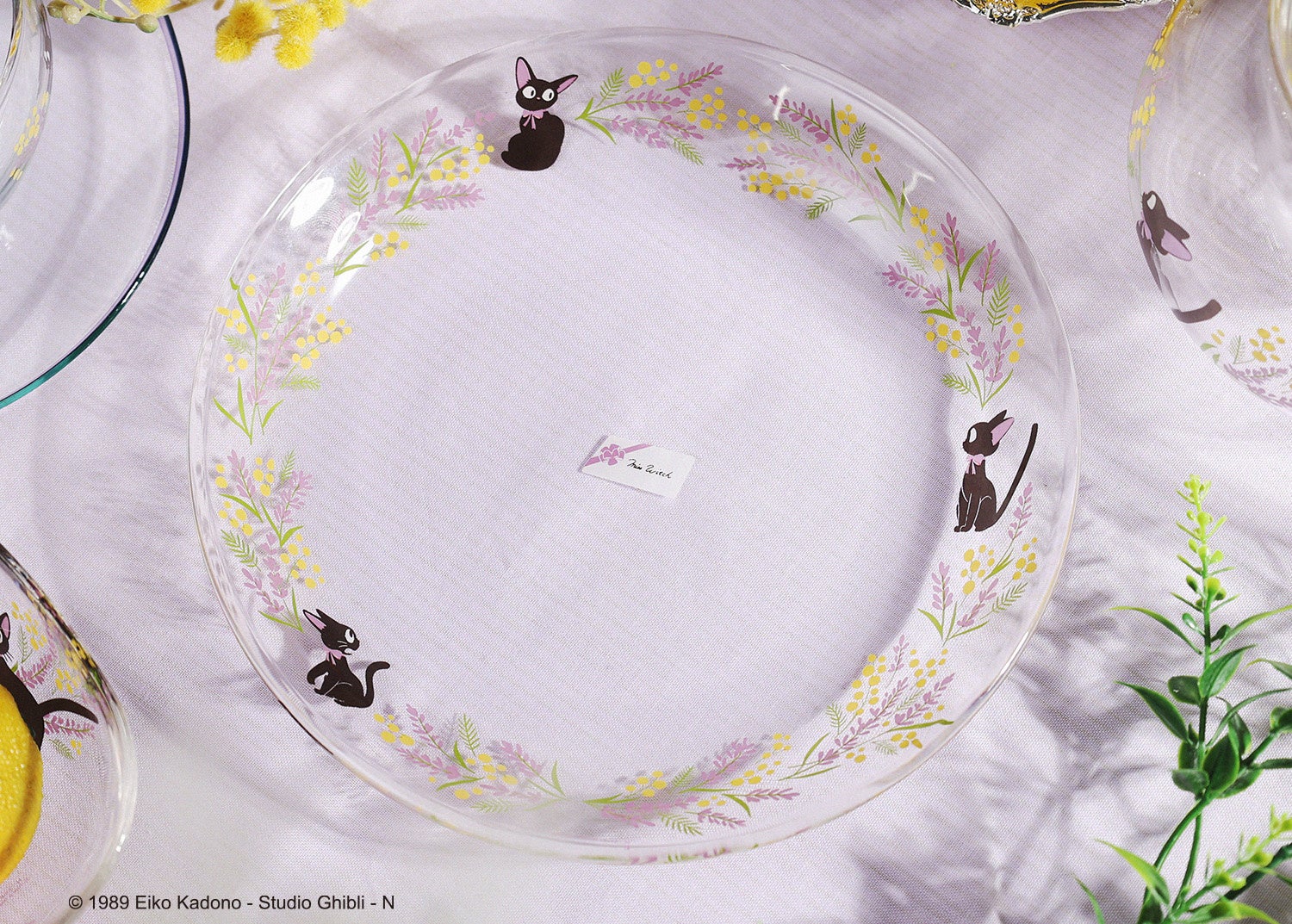 ラベンダーとミモザのブーケ、黒猫のジジをデザインした春らしい色合いのガラス食器シリーズです。