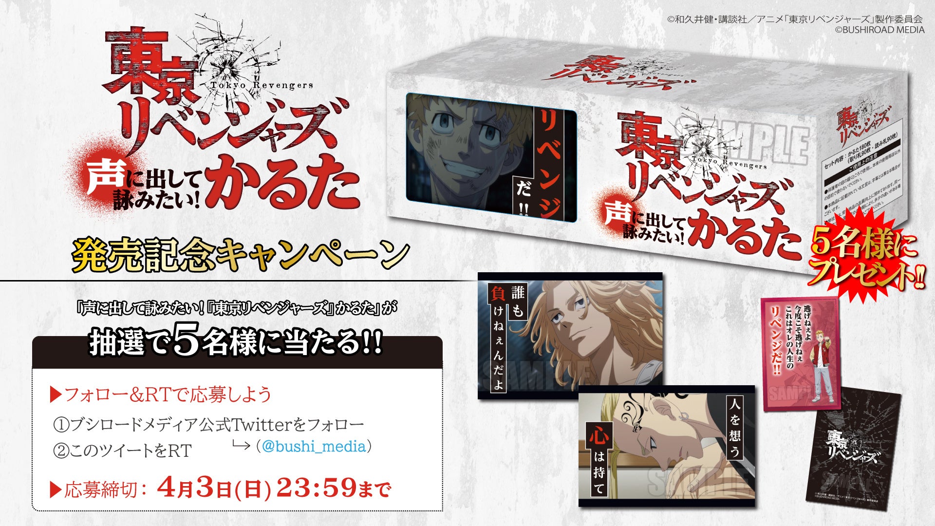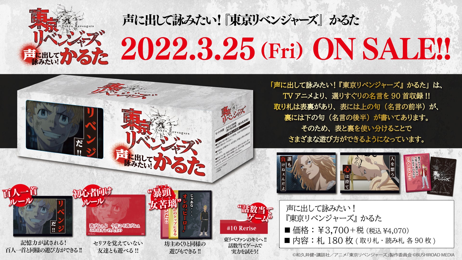 株式会社ブシロード(本社:東京都中野区、代表取締役社⻑:橋本義賢、以下ブシロード)のグループ会社にあたる株式会社ブシロードメディア(本社:東京都中野区、代表取締役社長:成田耕祐)は、本日3月25日(金)に「声に出して詠みたい!『東京リベンジャーズ』かるた」が発売することをご案内致します。皆様におかれましては是非誌面・Web記事等で本内容をお取り扱いいただきますようお願い申し上げます。