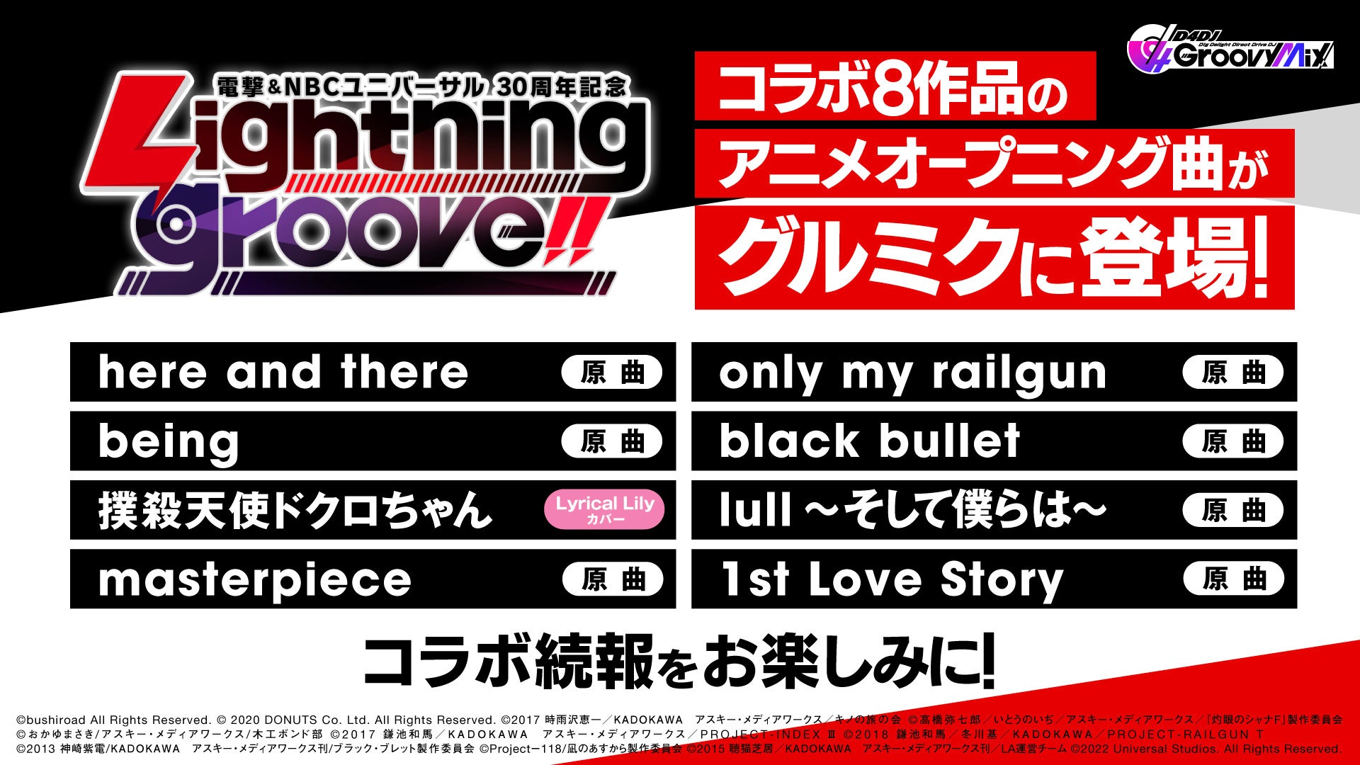 NBCユニバーサルアニメ音楽事業30周年を記念して、ゲームアプリ「D4DJ Groovy Mix」とのコラボが実現!!NBCユニバーサルでアニメを手掛けている電撃文庫の人気タイトル8作品と「D4DJ」のコラボが決定しました。コラボイベントは、4月4日(月)から開始となります。