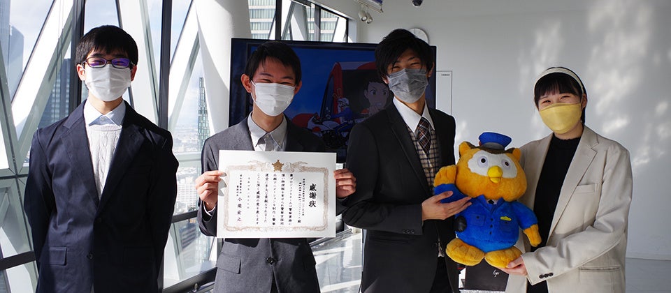 学生コメント:愛知県警察様と打合せを重ねながら制作を行い、先日完成のお披露目を兼ねた感謝状贈呈式を開催していただきました。自分たちのつくった映像が各地で放映され、多くの人の目に触れることに実感が湧くとともに、大きなやり甲斐を感じることができました。今回このような貴重な経験をさせていただき、深く感謝申し上げます。