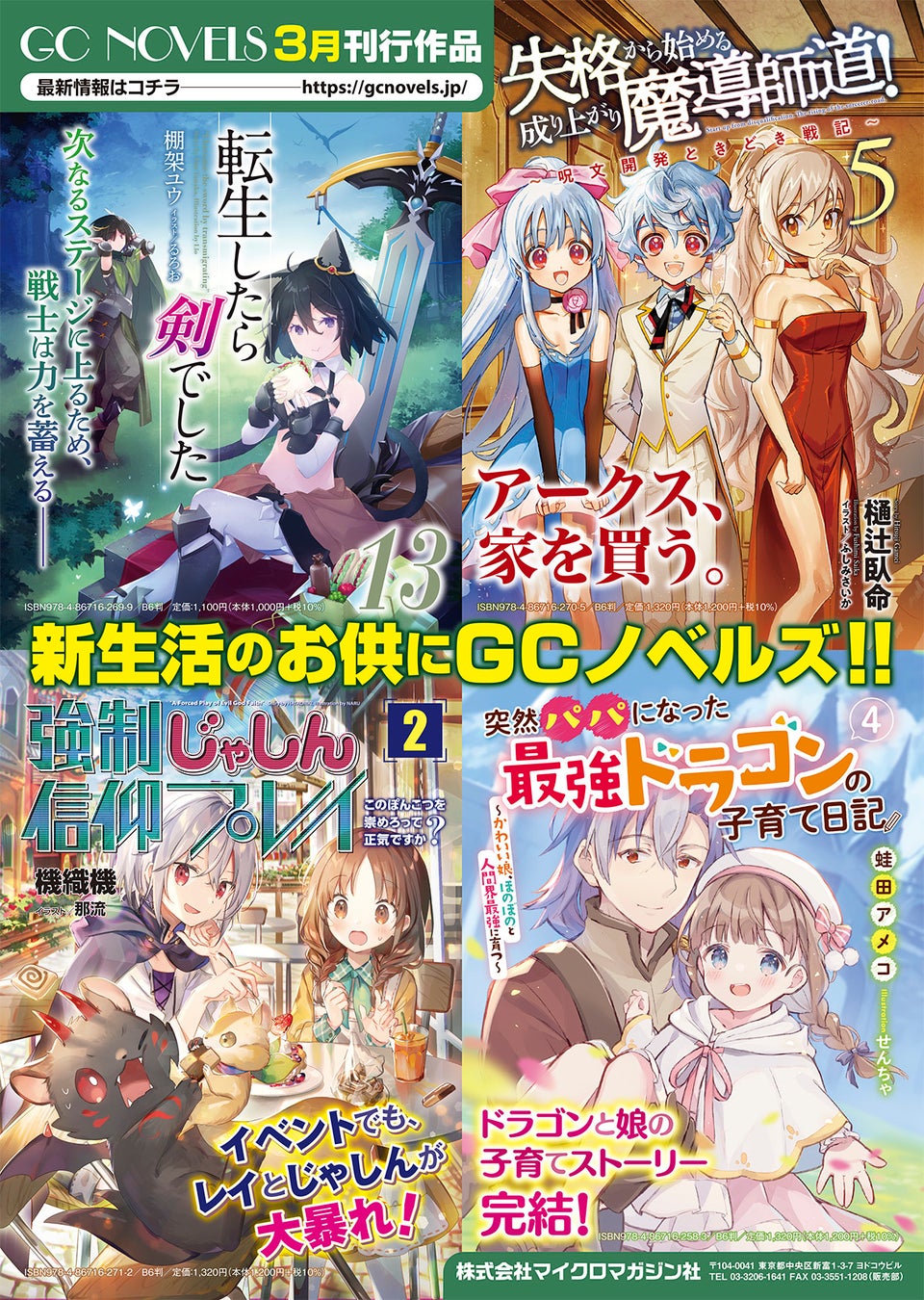 今⽉の新刊はTVアニメで話題の『転生したら剣でした』をはじめ、『失格からは始める成り上がり魔導士道!』『突然パパになった最強ドラゴンの子育て日記』『強制じゃしん信仰プレイ~このぽんこつを崇めろって正気ですか?~ 2』の4作品です。