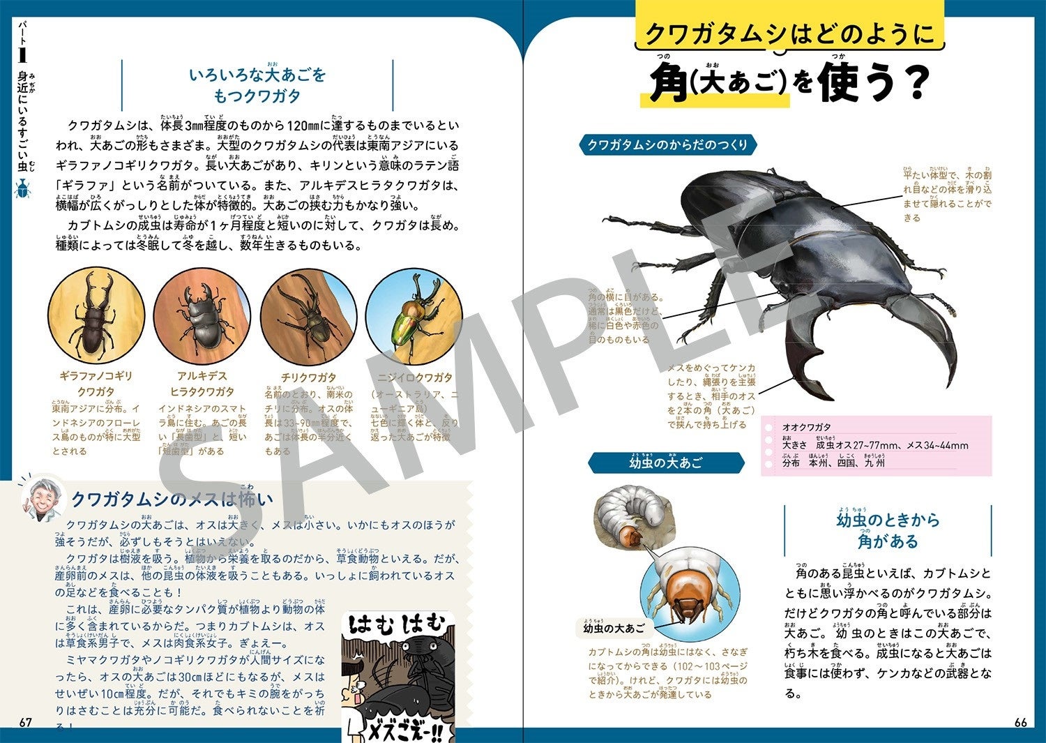 図解ページでは彼らの生態をより詳しく解説。最新研究でわかった事実も多数掲載しており、興味を持った昆虫についてより深く学ぶことが出来ます。