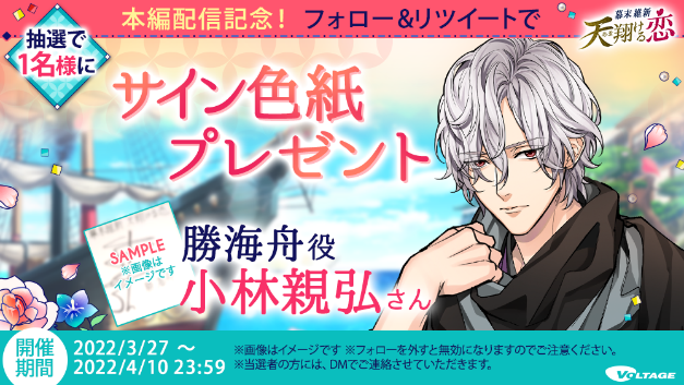 株式会社ボルテージ(本社:東京都渋谷区 代表取締役:津谷 祐司)は、提供中のボル恋タイトル「幕末維新 天翔ける恋」(以下「幕天」)にて、勝海舟の本編ストーリーを4月1日(金)より配信開始したことをお知らせいたします。