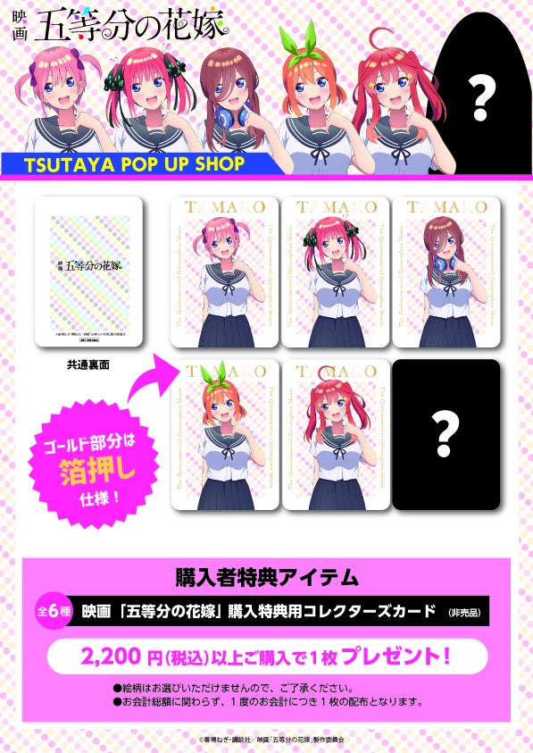 カルチュア・エンタテインメント株式会社(本社:東京都品川区 代表取締役社長:中西 一雄)は4月15日(金)より、全国のTSUTAYAにて開催の、週刊少年マガジンに連載された『五等分の花嫁』(著者:春場ねぎ)を原作とする「五等分の花嫁」のPOP UP SHOP『五つ子ちゃん、全員タマコ演じます!』にて、新規描き下ろしイラストを使用したグッズを販売いたします。