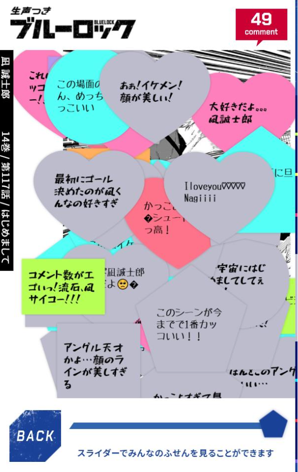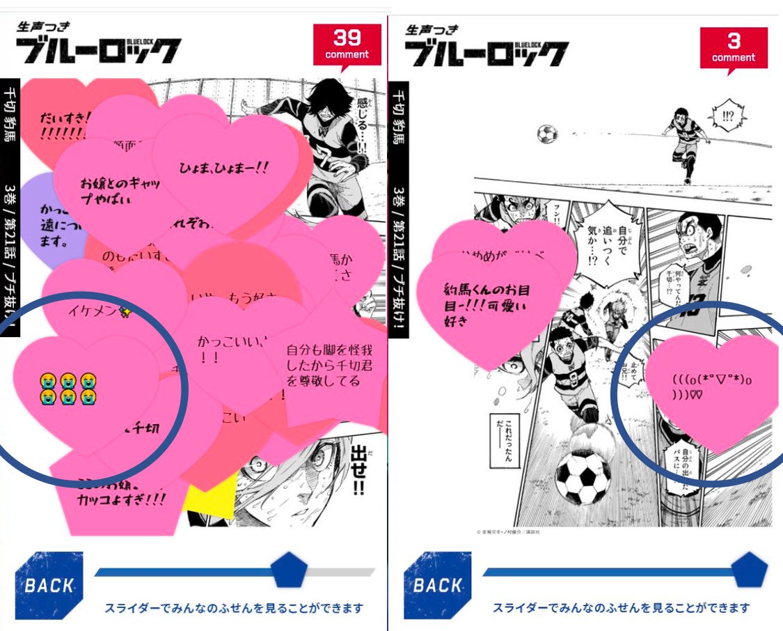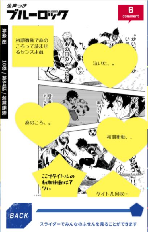 『ブルーロック』コミックス第1巻に加え、主要キャラクター7人が活躍する人気回 21 話分を 無料で読めるほか、好きなシーンに「ふせん」を貼ってあなたの〝生声感想〟を書き込むこ とができる期間限定のスペシャルサイト。今までのサッカー漫画にはなかった『ブルーロッ ク』ならではの名言や、圧倒的迫力で描かれる躍動感のある名シーン、好きなキャラクター の推しポイントなど、心を揺さぶる箇所に「ふせん」を貼って、あなたの〝生声〟を投稿し よう。みんなが貼った「ふせん」を見て楽しんだり、投稿した「ふせん」を SNS でシェア することもできます。