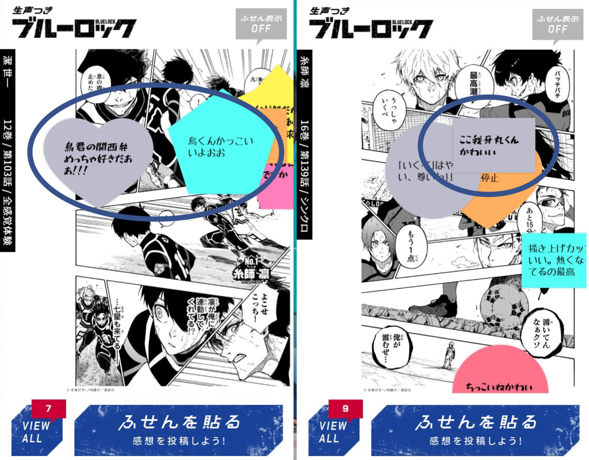 「生声つきブルーロック」ではファンのアツい想いが込もったふせんを共有し、楽しむことできます。ふせんを投稿することはもちろん、みんなが投稿したふせんを眺めながら、まるでパブリックビューイングかのように「ブルーロック」の世界を共有できるのもこのサイトの楽しみ方。ここではそんなふせんの楽しみ方をいくつか紹介します!