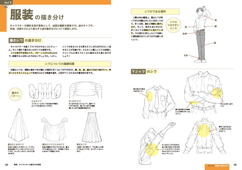 「どのようなしぐさで感情が表現できるか?」「物を掴むとき体のどこが動くのか?」「体のどの部分に服のシワができやすいか?」「体型や年齢を描き分けるコツは?」など、具体的な例とともにわかりやすく解説しているので、キャラクターをイキイキと描くためのポイントを掴むことができるでしょう。