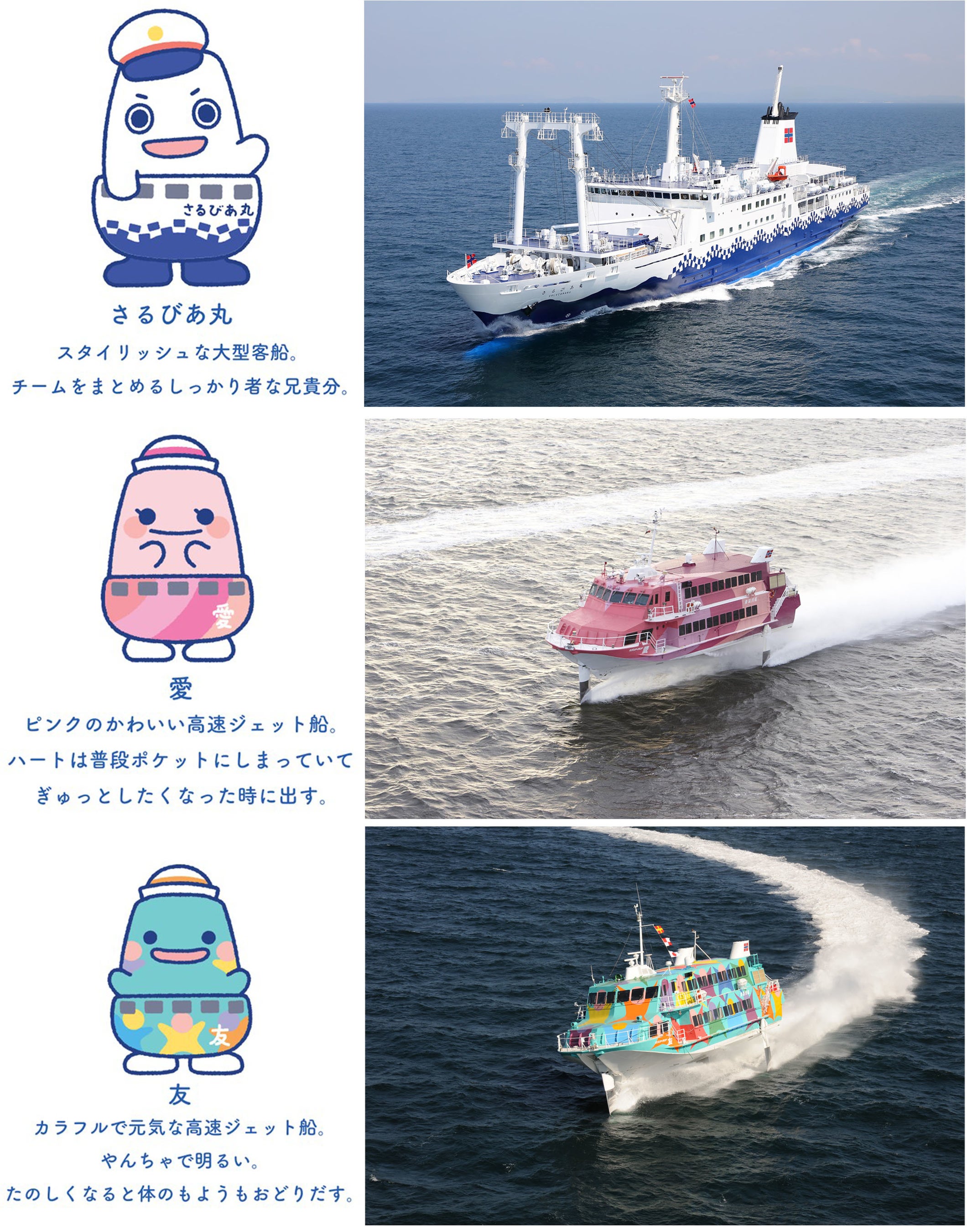 2隻の貨客船(大型客船)と4隻の高速ジェット船を所有しており、本土と島、人と人を繋ぐ架け橋として毎日運航しています。