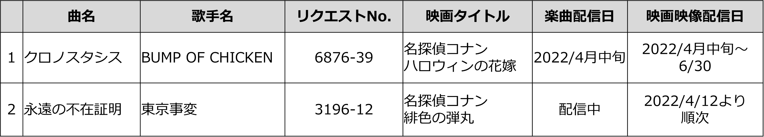 | ①劇場版最新作『名探偵コナン ハロウィンの花嫁』の主題歌・BUMP OF CHICKEN「クロノスタシ ス」に期間限定で映画映像を配信*。【4月中旬~6月30日】 併せて、昨年公開の劇場版『名探偵コナン 緋色の弾丸』の主題歌・東京事変の「永遠の不在証明」 も映画映像で配信*。【4月12日より】 ② リクエストコマンダー・デンモク(SmartDAMシリーズ)から歴代の映画主題歌を予約したときに ③ TwitterのDAM CHANNEL公式アカウントをフォローの上、指定したハッシュタグを投稿した方の中 * 対象機種はLIVE DAM Ai およびLIVE DAM STADIUMシリーズです。 |