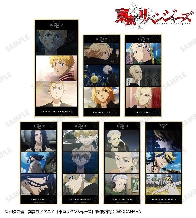 花垣 武道、佐野 万次郎、龍宮寺 堅、場地 圭介、松野 千冬、三ツ谷 隆、羽宮 一虎の場面写を名前やチーム名と合わせてデザインしました。