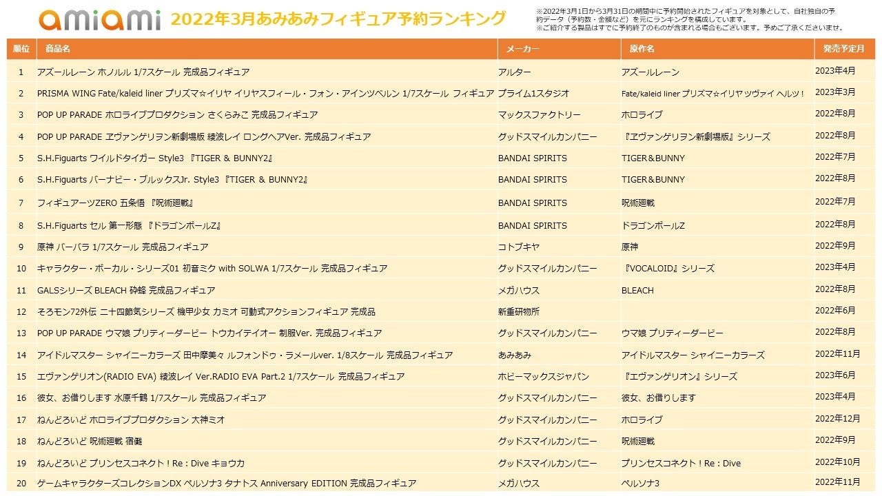 大網株式会社(東京都文京区)は、自社が運営するホビーショップ『あみあみ』の2022年3月フィギュア予約ランキングを発表いたしました。