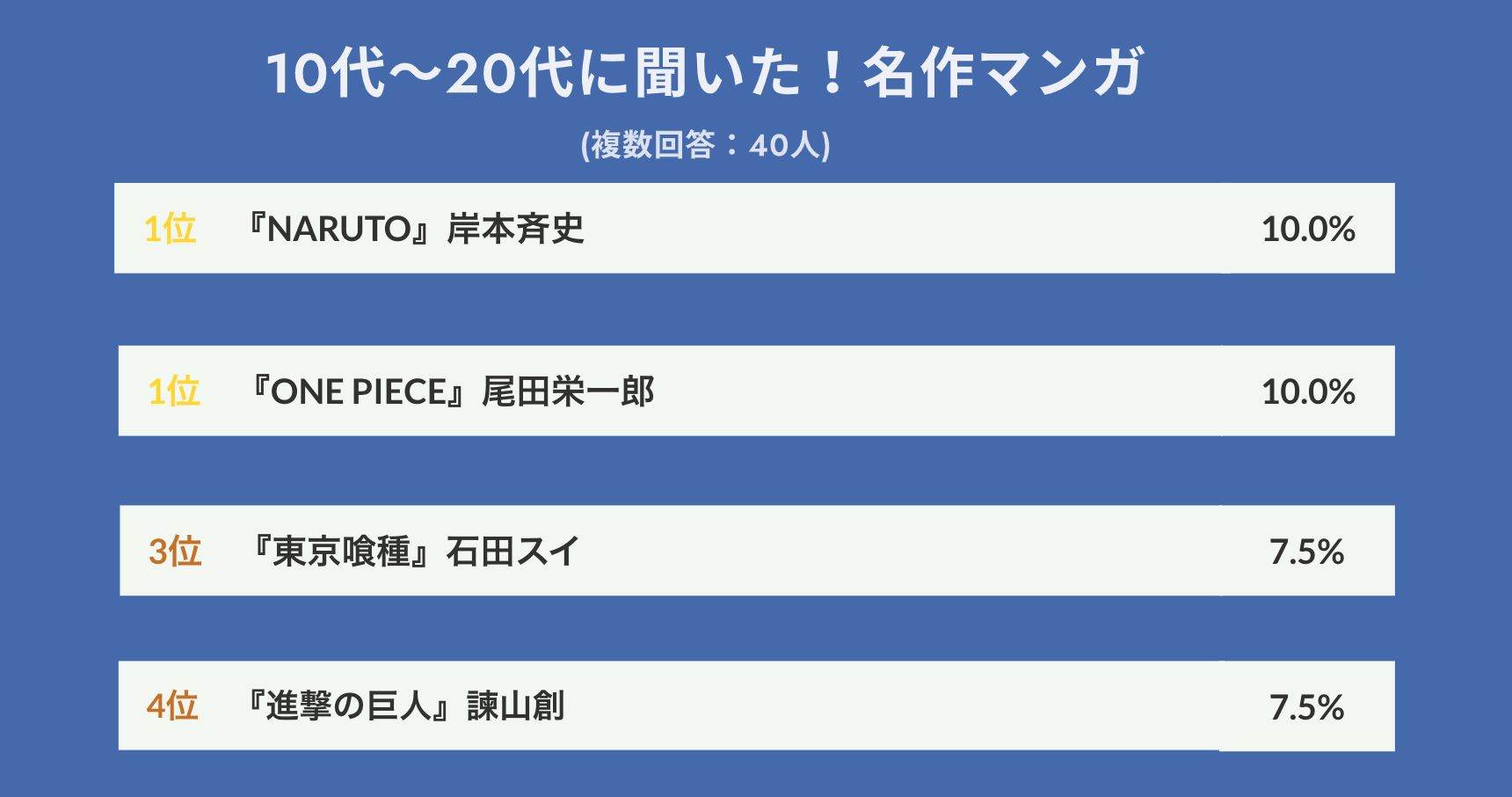 最も10〜20代の世代に名作と支持されているのは、同率1位で『NARUTO』と『ONE PIECE』という結果に。どちらも集英社ジャンプの王道少年漫画です。