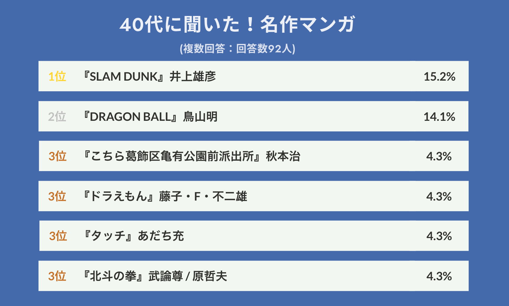 最も40代の世代に名作と支持されているのは、30代と同様に『SLAM DUNK』という結果に。僅差で2位に『DRAGON BALL』が続きます。長い間、この2作品が幅広い年代に支持されていることが分かります。