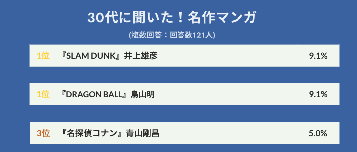 最も30代の世代に名作と支持されているのは、同率1位で『SLAM DUNK』と『DRAGON BALL』という結果に。この世代でも集英社の週刊少年ジャンプ作品が強く支持されています。