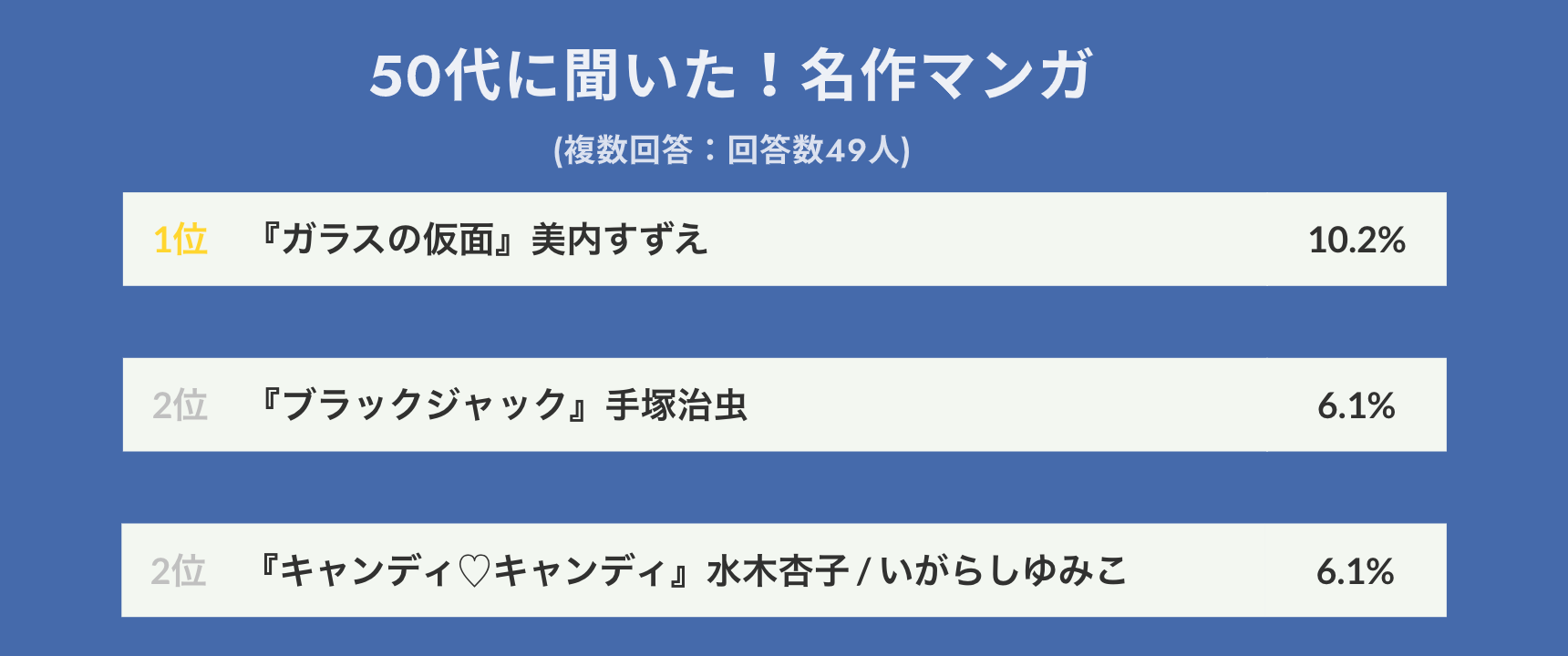 最も50代の世代に名作と支持されているのは、『ガラスの仮面』という結果に。女性からの指示を多く集めました。
