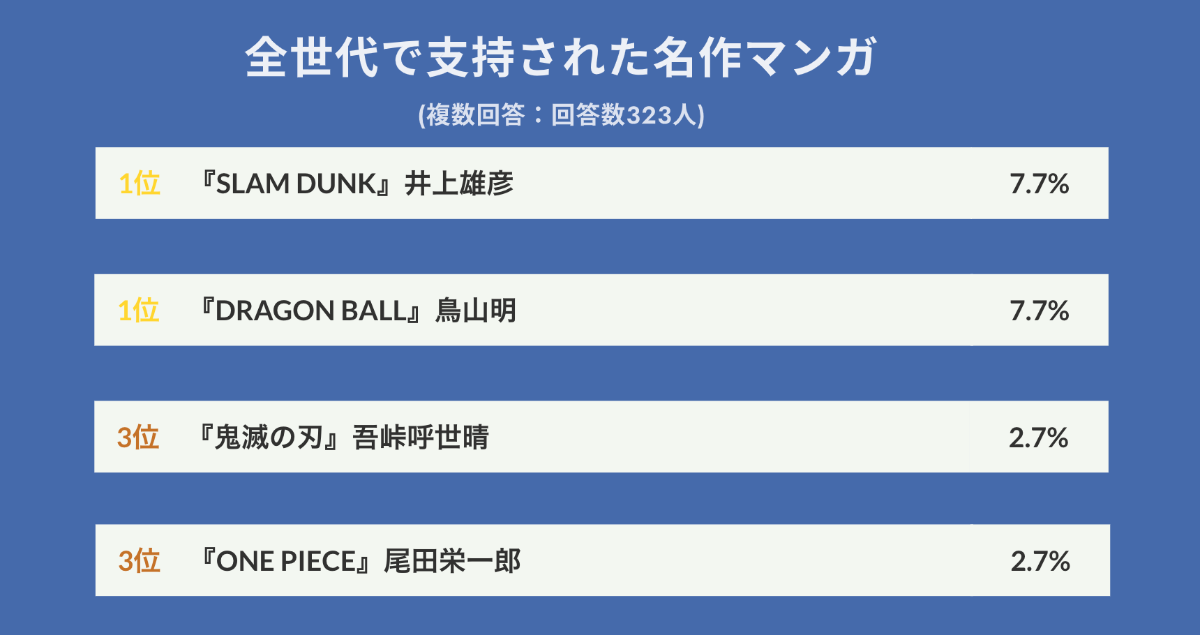 最も10〜60代以上の全世代に名作と支持されているのは、同率1位で『SLAM DUNK』と『DRAGON BALL』という結果に。30代と40代の両世代に支持されている層の厚さがこの結果に繋がりました。