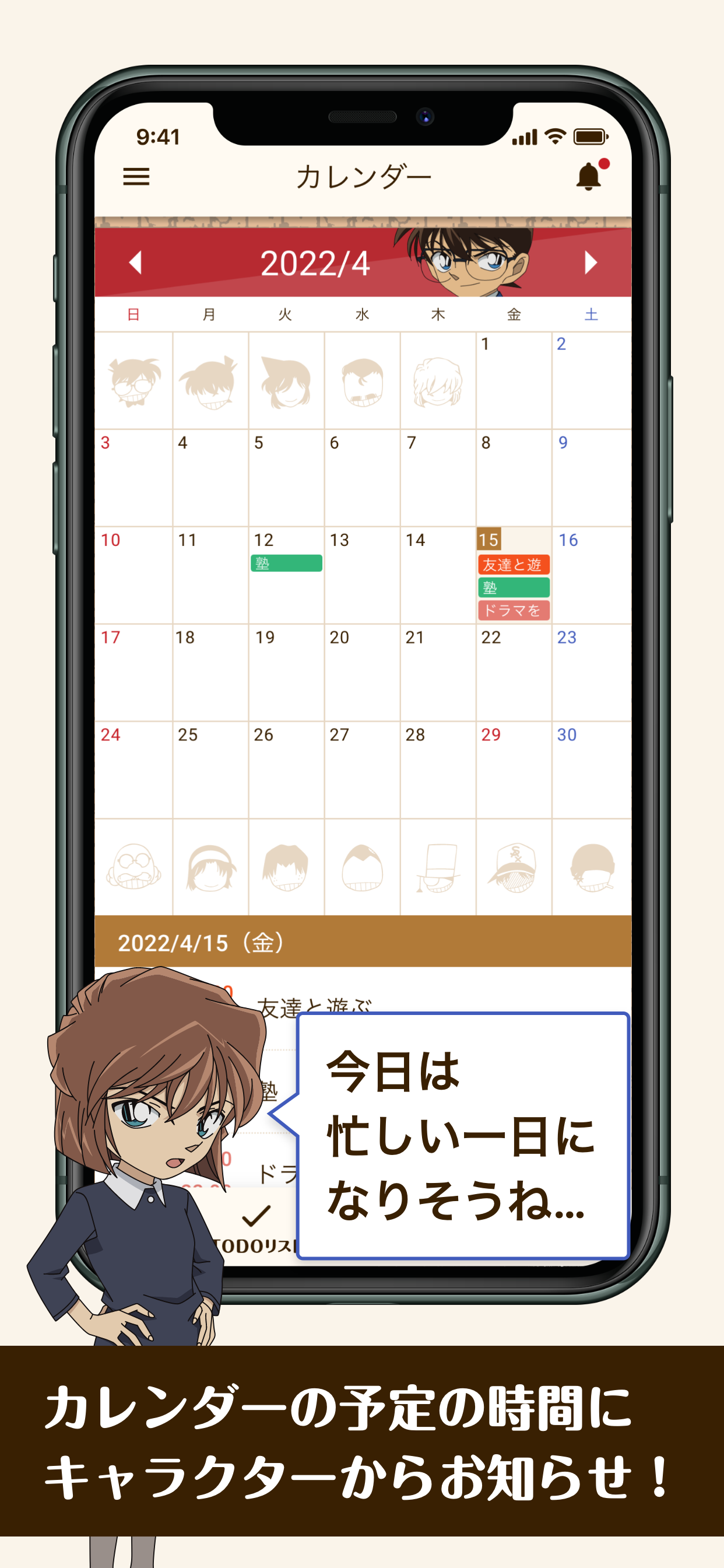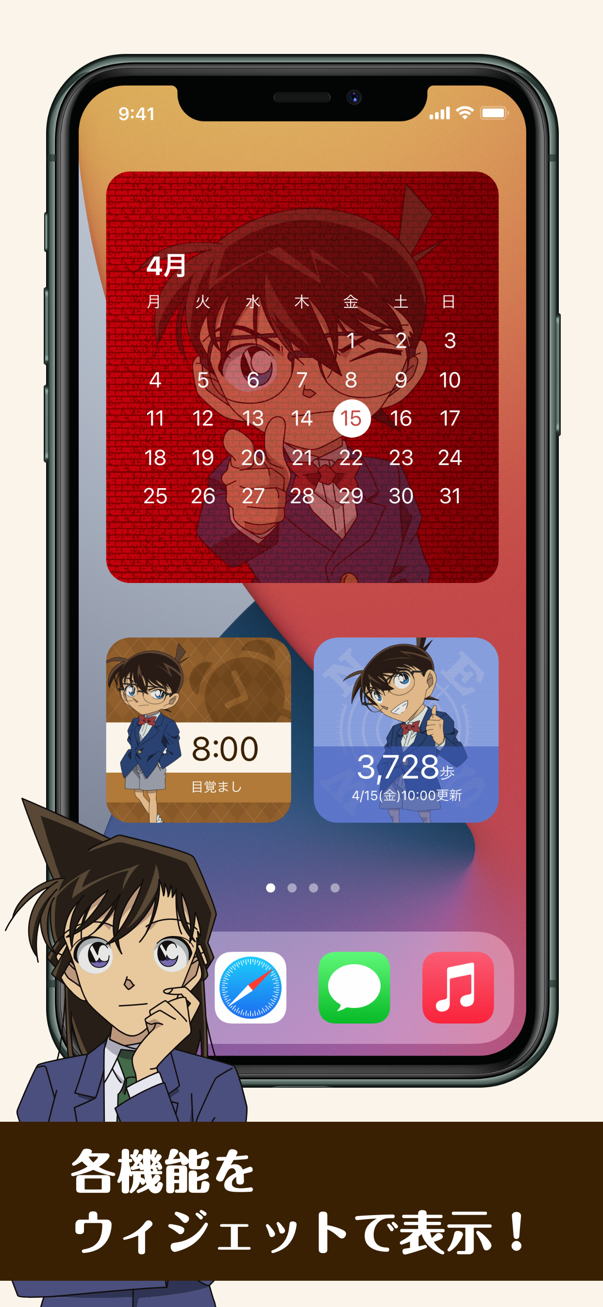 本アプリは、人気アニメ「名探偵コナン」に登場するキャラクターたちと一緒に、日々の予定を管理できる「カレンダー」機能と、自身のスマートフォン上にキャラクターのウィジェットを配置することのできる「ウィジェット」機能を兼ね備えたツールアプリです。