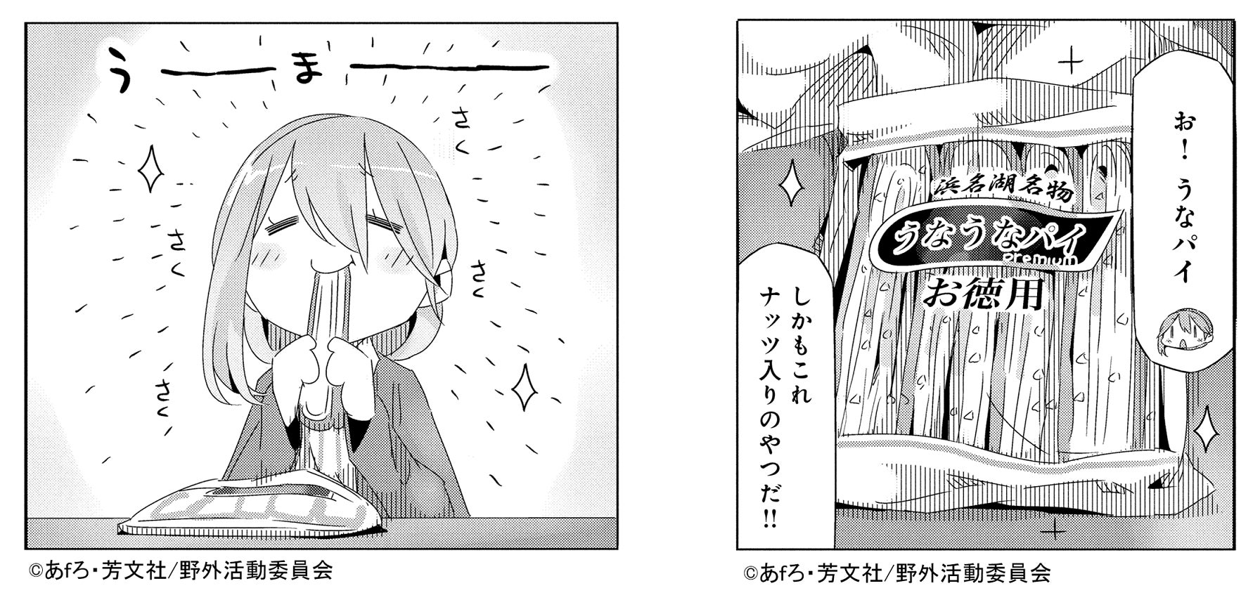 有限会社春華堂(本社:静岡県浜松市、代表取締役社長:山崎貴裕)は、2022年4月23日(土)より春華堂直営店およびギフトキヨスク浜松にて、 『ゆるキャン△』シリーズの作品中で登場する「うなうなパイ お徳用 ナッツ入り」を数量限定で販売いたします。作品中で「うなうなパイ」は主要キャラクターの一人である「各務原なでしこ」が浜松のおばあちゃんの家に訪れるシーンで登場します。この度、春華堂は『ゆるキャン△』制作チームからの熱い要望にお応えし、作品中に登場した「うなうなパイ お徳用」を忠実に再現しました。