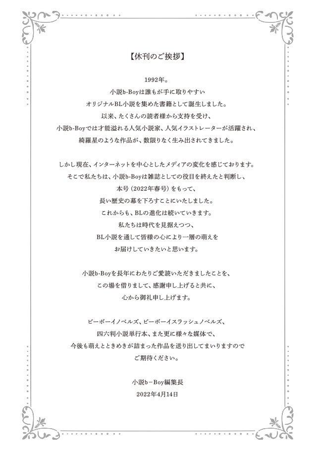 そこで私たちは、小説b-Boyは雑誌としての役目を終えたと判断し、本号(2022年春号)をもって、長い歴史の幕を下ろすことにいたしました。