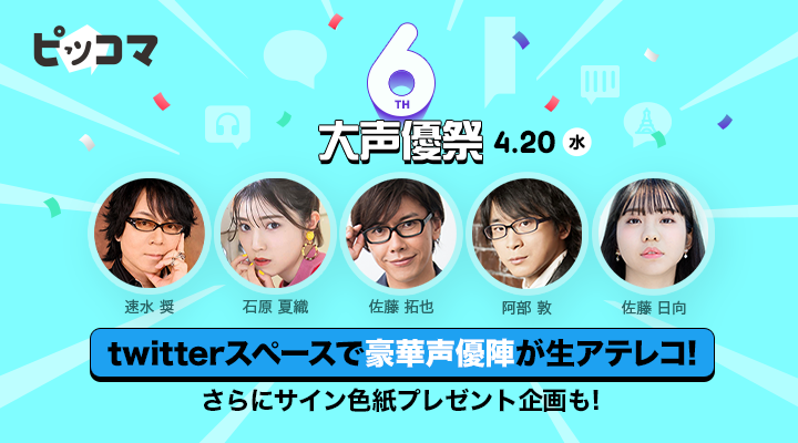 4/20(水)20:00 「ピッコマ」では、Twitterスペースにて「大声優祭」を配信いたします。出演は速水奨さん、石原夏織さん、阿部敦さん、佐藤拓也さん、佐藤日向さんの5名です。