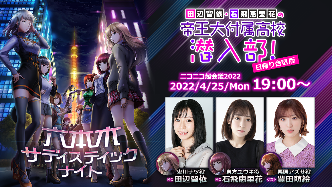 2022年1月より「六本木サディスティックナイト」公式YouTubeチャンネルにてレギュラー配信を開始し、ご好評いただいている番組「田辺留依・石飛恵里花の帝王大付属高校潜入部!」の特別放送を4月25日(月)に「ニコニコ超会議2022」内「超声優祭」にて実施いたします。