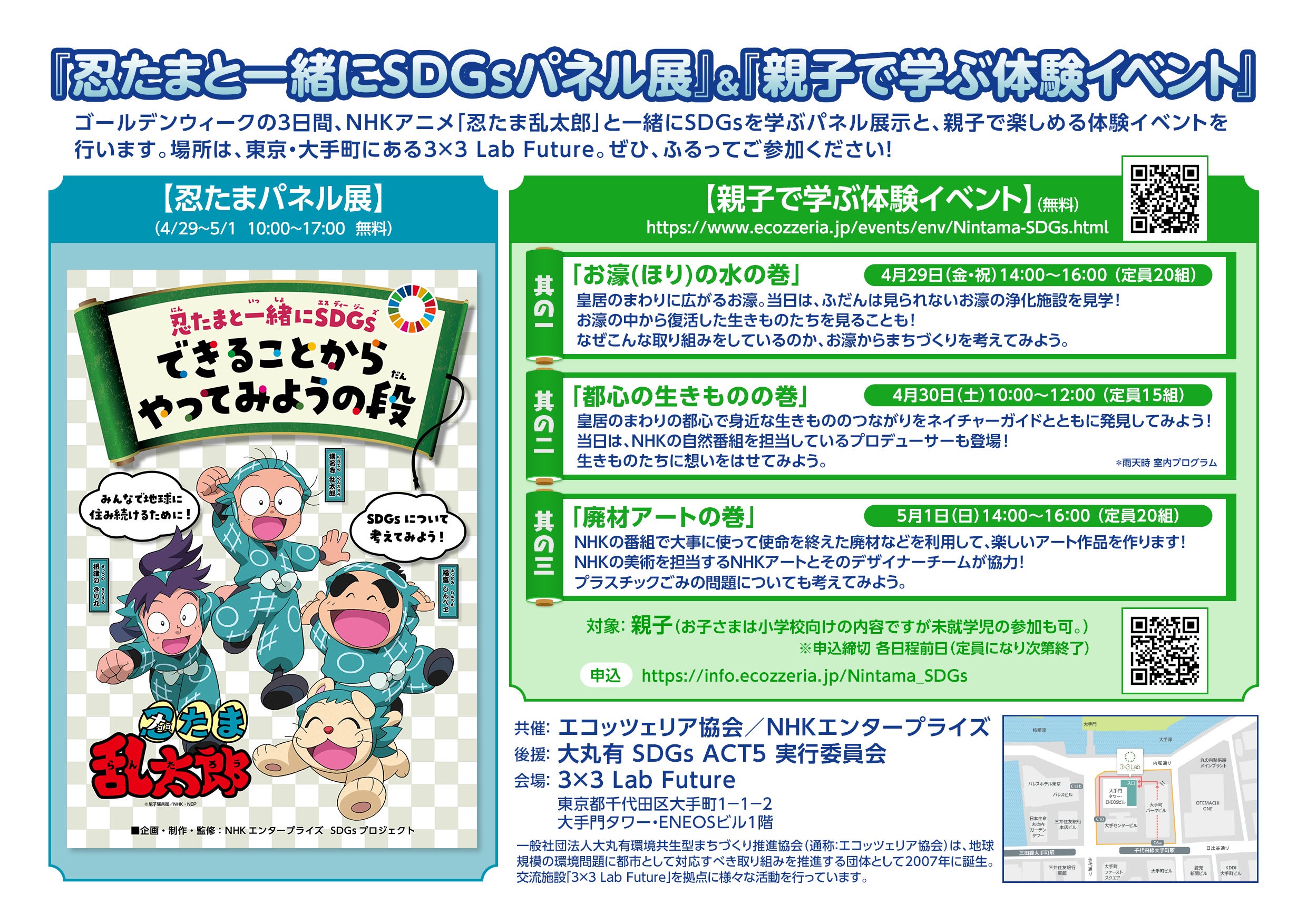 一般社団法人 大丸有環境共生型まちづくり推進協会(通称:エコッツェリア協会 所在地:東京都千代田区 理事長:伊藤滋)と株式会社NHKエンタープライズ(本社:東京都渋谷区 代表取締役社長:松本浩司)は、4月29日(祝・金)から3日間、東京・大手町の3×3Lab Future(さんさんラボ フューチャー)で、NHKアニメ「忍たま乱太郎」と一緒にSDGsを学ぶパネル展示と、親子で楽しめる体験イベントを行います。
