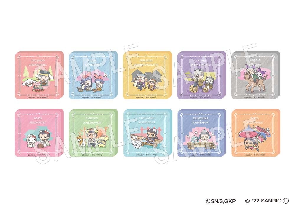 ラインナップ:杉元&シナモロール、アシㇼパ&マイメロディ、白石&おさるのもんきち、鶴見&バッドばつ丸、土方&クロミ、尾形&ハローキティ、谷垣&ポムポムプリン、キロランケ&KIRIMIちゃん.、月島&ハンギョドン、鯉登&タキシードサム(全10種)