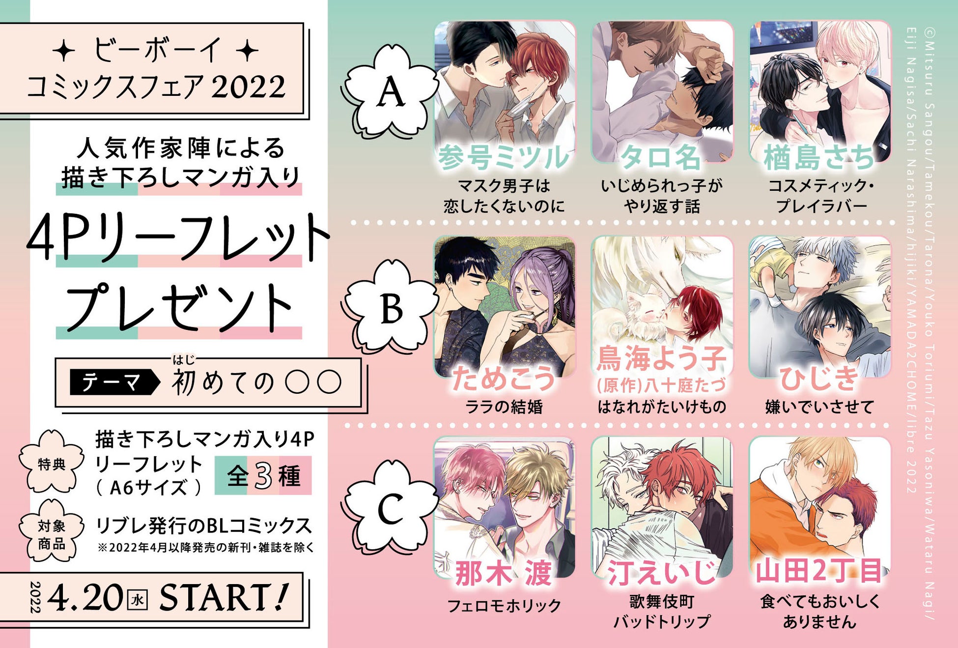 株式会社リブレ(本社:東京都新宿区、代表取締役社長:太田歳子)は、毎年恒例の大型コミックスフェア「ビーボーイコミックスフェア2022」を2022年4月20日(水)より開始いたします。