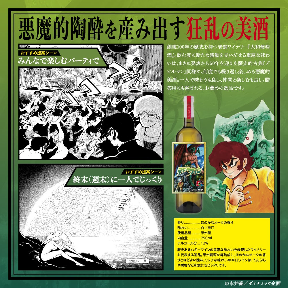 永井豪による傑作『デビルマン』と『マジンガーZ』誕生50周年を記念して、甲州の老舗ワイナリー『大和葡萄酒』との豪華なコラボレーションワインが実現!今回販売されるのは『デビルマン』をモチーフとした狂乱の白ワインと、『マジンガーZ』をモチーフとした鋼鉄の赤ワインの2種。それぞれ日本を代表する逸品同士が織り成す味わいは神か?悪魔か?それとも…!? インパクトあるオリジナルラベルのデザインは、贈答用にも喜ばれる、大人のプレゼントにも最適。互いに歴史を感じさせる重厚な味わいをお楽しみください。
