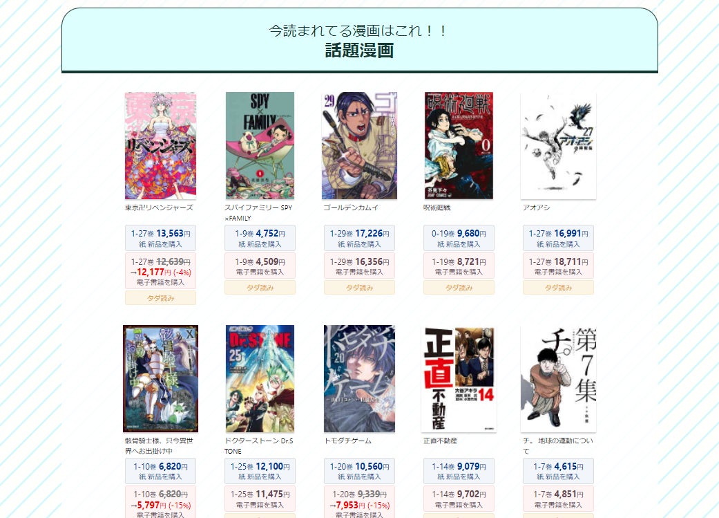 1巻から最終巻まで全巻まとめ買いできるインターネット書店です。紙も電子も豊富な取り揃えでお探しのコミックがきっと見つかるはず。お客様の用途にあわせて多様な方法で漫画をお楽しみいただけるネット書店としてサービス展開しています。