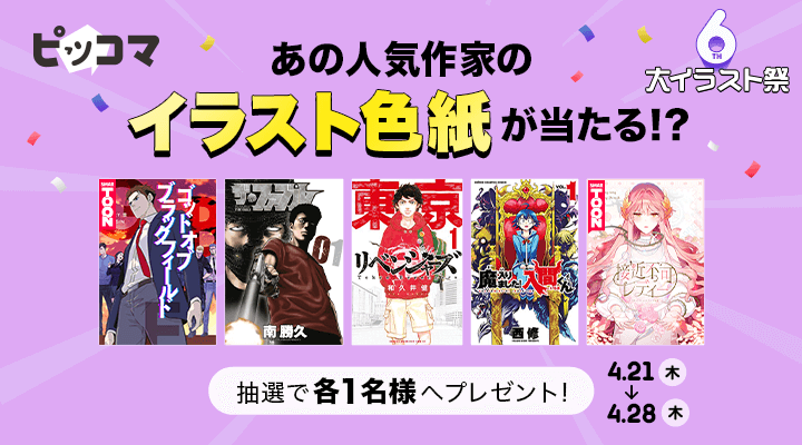 「大イラスト祭」では、この34作品の貴重な描き下ろしイラストを特別ページで紹介するとともに、抽選で各1名様へ色紙をプレゼントいたします。応募期間は4/21(木)〜4/28(木)の8日間。ピッコマアプリのイベントページから応募可能です。また、この8日間はピッコマの公式Twitter・ Instagramで34作品のイラストを紹介。ぜひピッコマの公式Twitter・ Instagramをフォローして、ファン垂涎の描き下ろしイラストを楽しんでください。