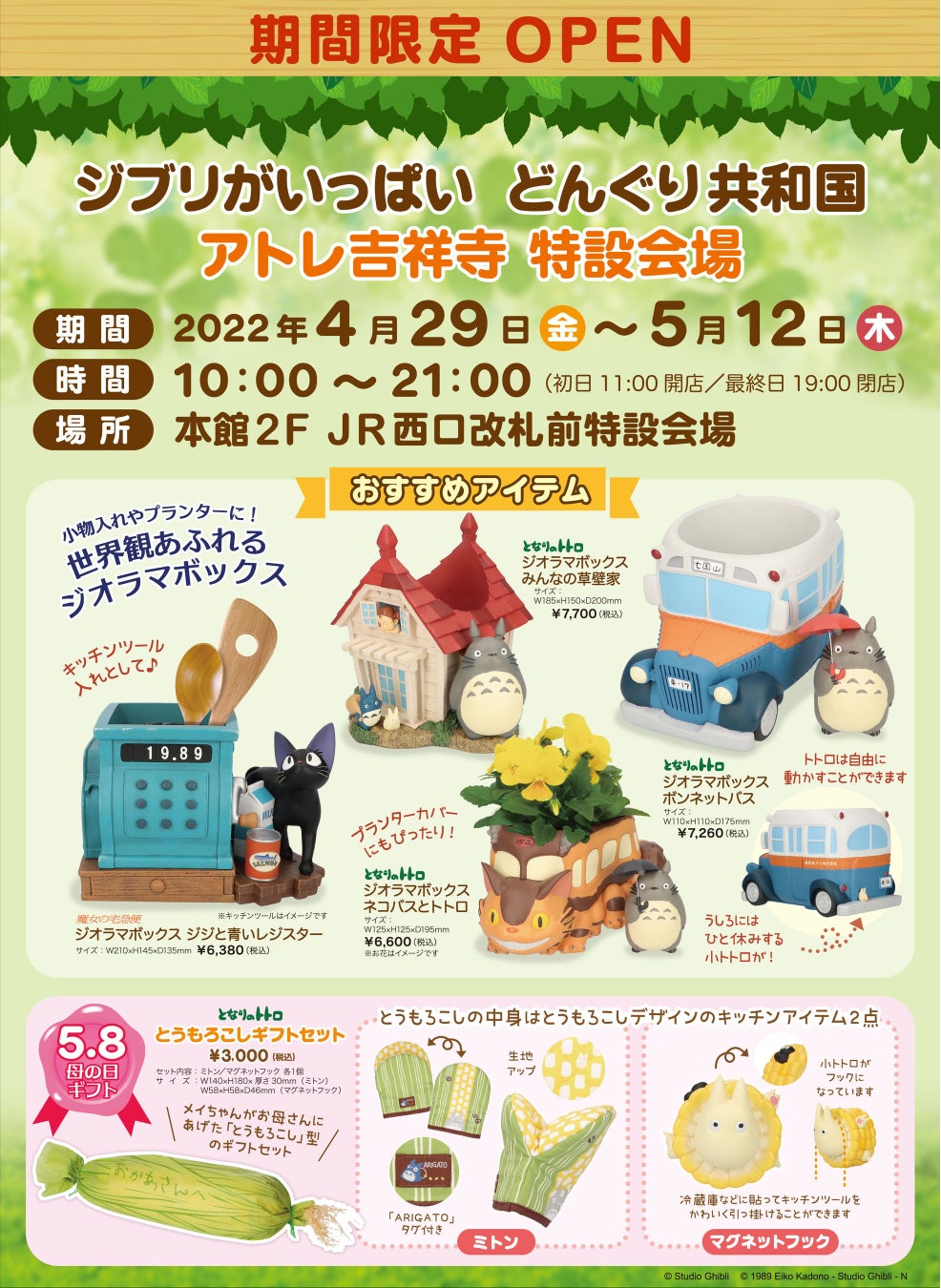 ベネリック株式会社(所在地:東京都千代田区、代表:永利道彦) の運営する、スタジオジブリ作品グッズショップ「ジブリがいっぱい どんぐり共和国」は、2022年4月29日(金・祝)より5月12日(木)までの期間限定でアトレ吉祥寺(所在地:東京都武蔵野市)に出店いたします。