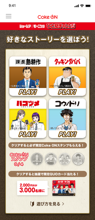 コカ・コーラ公式スマートフォンアプリ「Coke ON」では、キャンペーン期間中、オリジナルゲーム「ジョージア ひと息チャレンジ」と題し、「島耕作」「コウノドリ」「ハコヅメ〜交番女子の逆襲〜」「クッキングパパ」の各作品のオリジナルストーリー漫画を読みすすめ、ミニゲームなどのミッションクリアでレベルアップを繰り返し、
