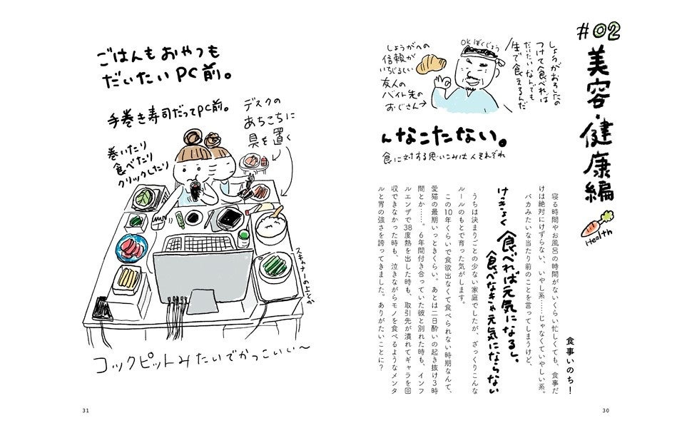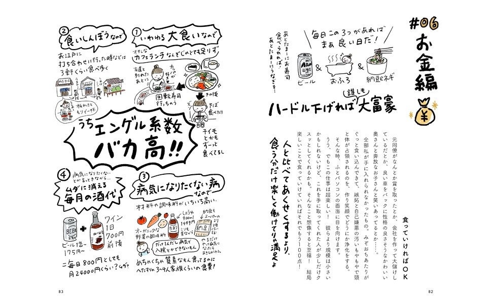 「結婚しない」「営業しない」「後悔しない」をモットーに、イラストとマンガ、写真、エッセイで赤裸々に告白。右手にマウス、左手にごはん(二刀流か)、営業時間は一日24時間、年中無休(それって、ブラックだろっ)、忙しいときは時間がない、暇なときはお金がない(老後はどうなるんじゃ)と、思わずツッコミたくなる、フリーランスの日常がまるわかりです。